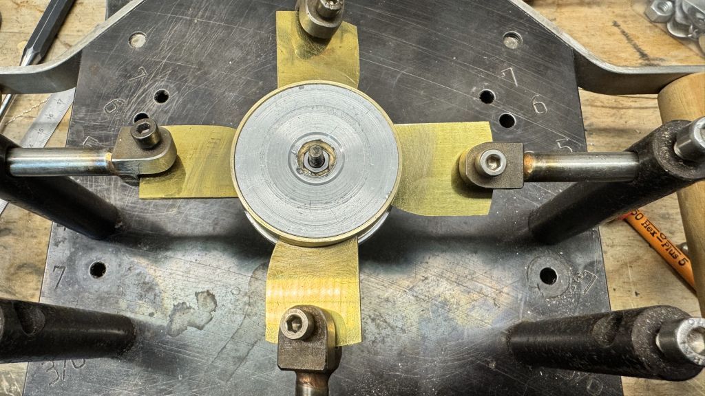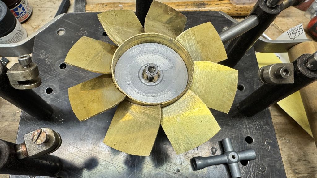 Für die Ventilatorgebläse der Ölkühler wollte ich nicht einfach PC-Lüfter verwenden, die Anzahl und die Form der Blätter sollten schon passen. Profiliert sind die Blätter nicht, das hätte den Aufwand doch gesprengt. Entstanden ist alles aus Messing und danach weichverlötet per Propellerlötlehre, die eigentlich für die Sichelpropeller bei unseren U-Booten zum Einsatz kommt.