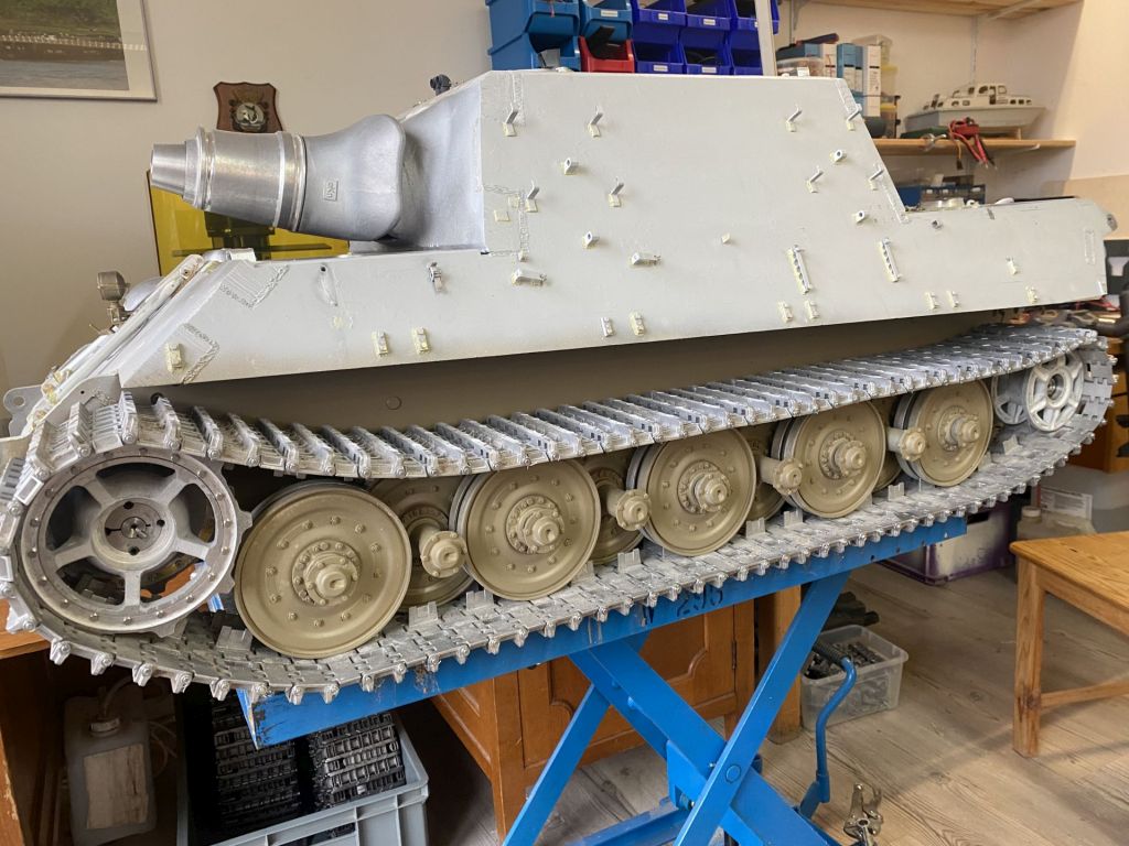 Apropos Ketten: meine Stahlketten wurden in D konstruiert und auf dem Balkan gefertigt (im Wachs-Ausschmelzverfahren). Es ist nicht die übliche Kette, sondern der zu Kriegsende eingeführte einteilige Kettentyp KGS 73/800/152 mit dem 18-zähnigen Treibrad, wie es zu Anfangszeiten des Königstigers schon mal benutzt worden war. Der Erbauer hat sich nicht gescheut, die Dinger aus Panzerstahl gießen zu lassen und auch bei den Formen erheblichen Aufwand zu treiben.