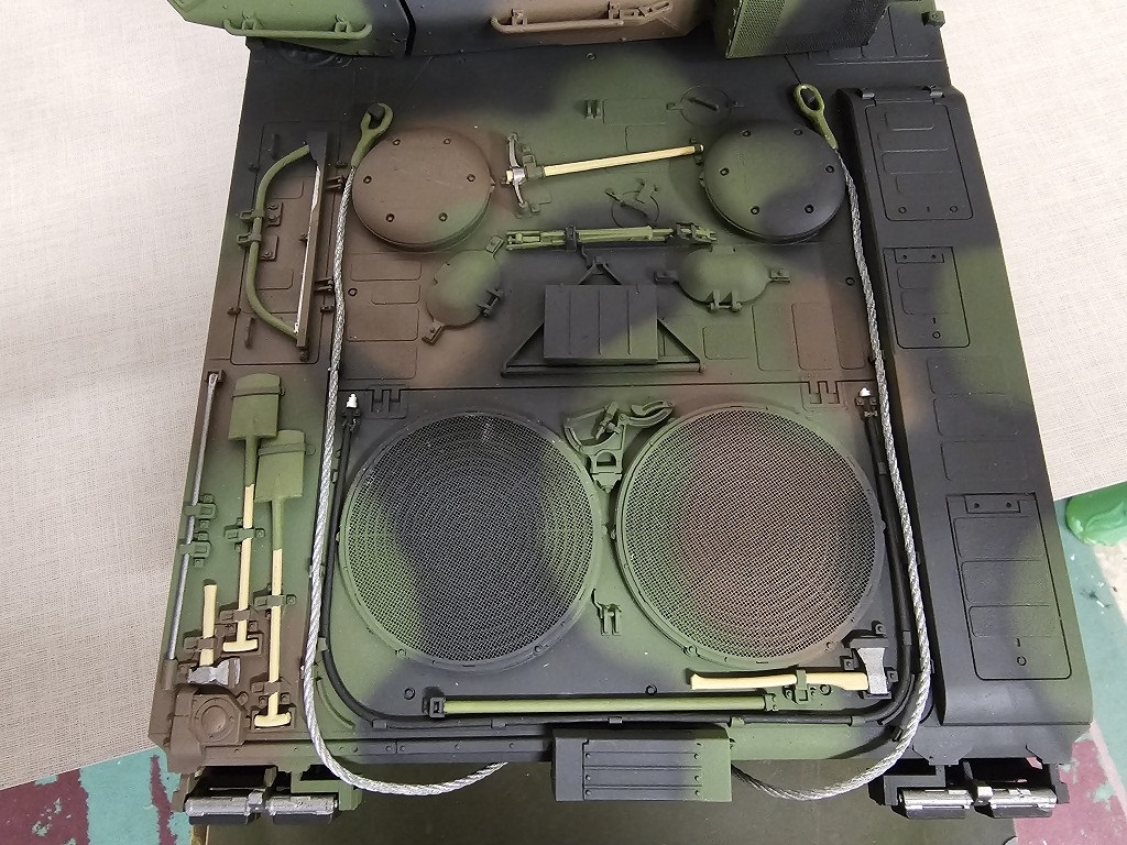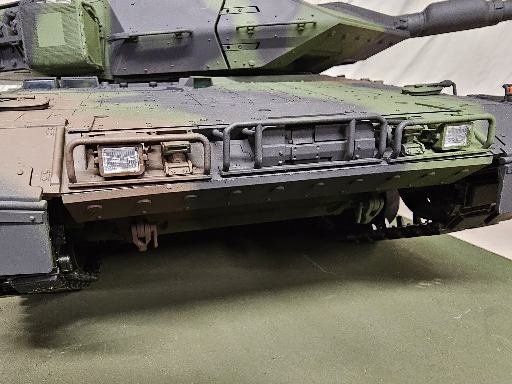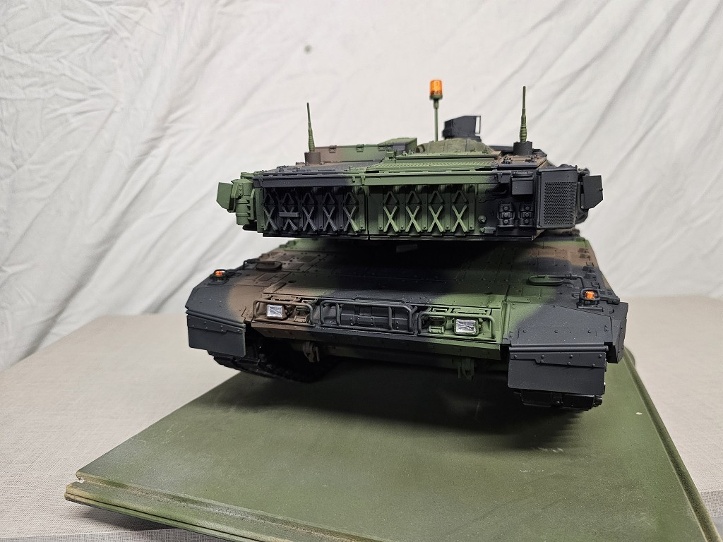 Schön. Der letzte 'echte Leo II' bevor er mit den Trophy-Anbauteilen endgültig zum Beulenpestzombie mutiert. Naja, das haben wir beim 2A4 auch gesagt, bevor die Anbauteile zur Ausführung 5 dran gepappt wurden. Trifft auch jedes Mal zu. Wird beim 2 A10 auch nicht anders sein, wenn irgendwie noch aus purer Verzweiflung eine ganz andere Umhüllung dran gezimmert kommt, was weiß ich mit Laserkanonenstationen oder Railguns, keine Ahnung.