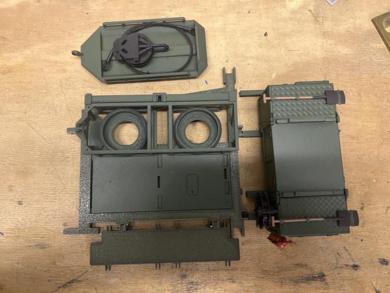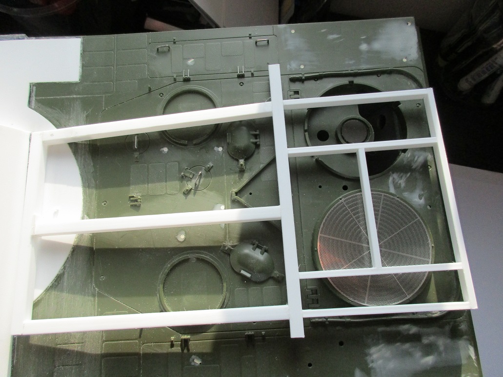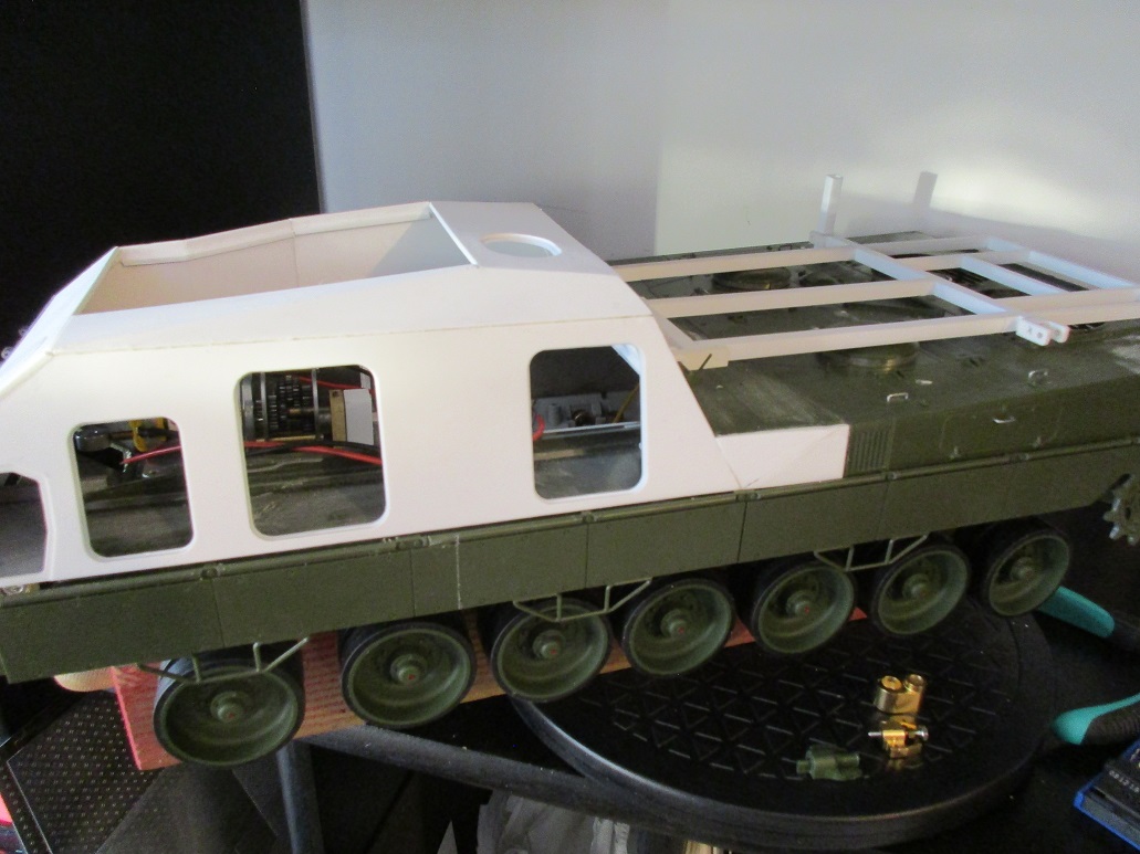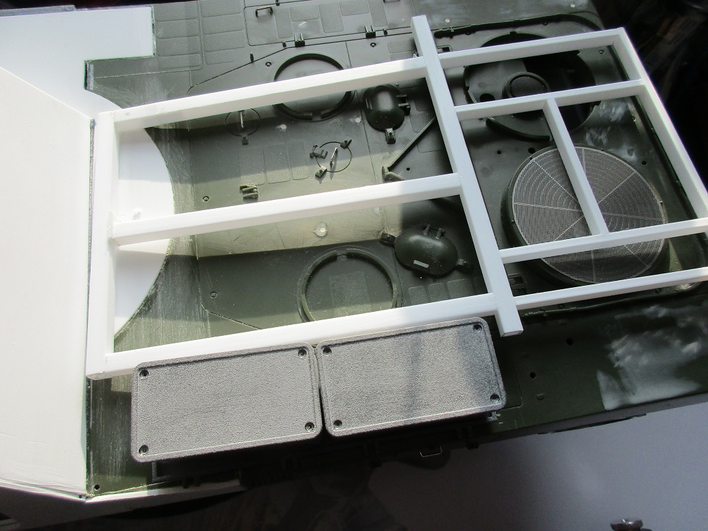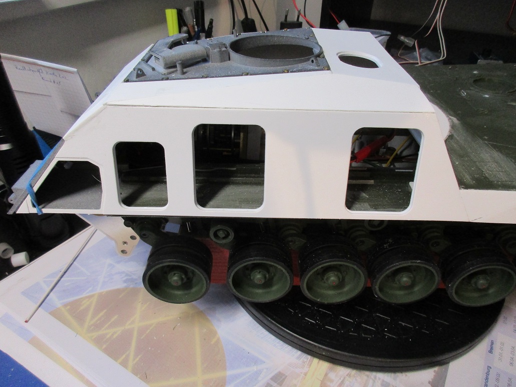 Weiterhin etwas klassischer Modellbau, wie Olaf ja sofort gesehen hat war der Rahmen des Ausrüstungsträgers zu kurz (jaja, wenn man im CAD nicht alles mitzeichnet....) dies hab ich korrigiert. Ausserdem hab ich aus Resten die leichten Kettenschürzen auch vorn gebastelt.