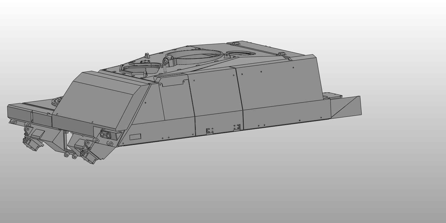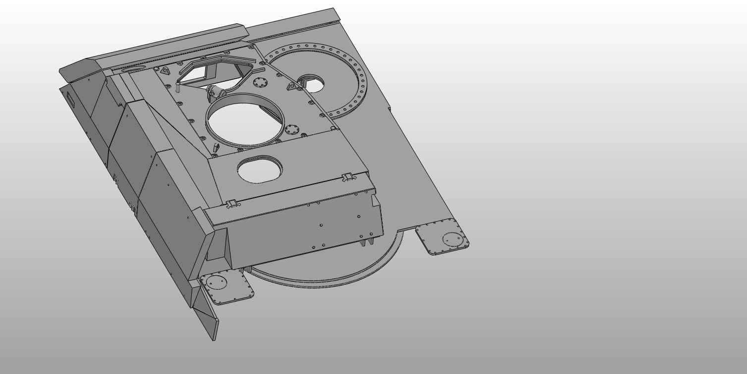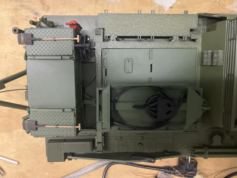 Mittlerweile habe ich die Frästeile an der zentralen Stelle, den Resten des Ex Turmdrehkranzes mit der Restwanne verklebt. Es passt wunderbar. Jetzt kann es mit der gesamten Kasematte weitergehen. Dazu die Aufnahmen hinten für die Gefechtsfeldbergeeinrichtung, die AFV Räumschildmechanik (nachgearbeitet, Antrieb getauscht, Endschalter befestigt und verkabelt....) und die Crawlerwinde schin mal eingesetzt. Die braucht noch eine Aufnahme, klar. Ausserdem den AFV Drehantrieb Kran mit Befestigungsbohrungen versehen.
