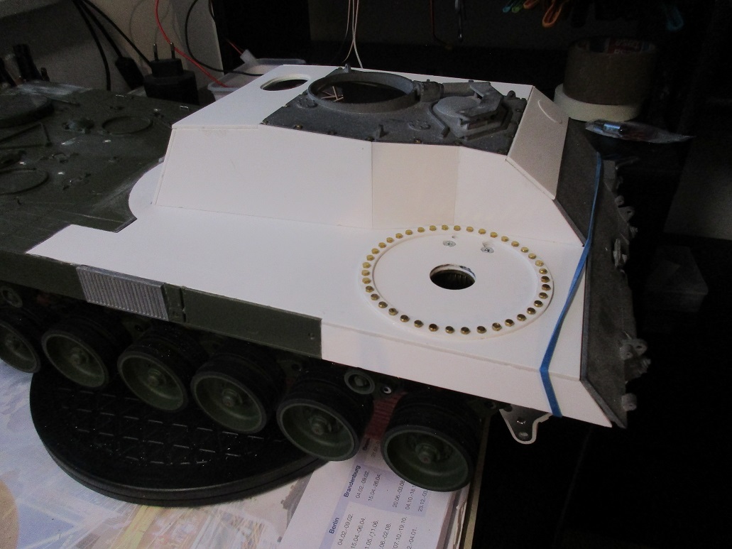 Auf Bild 1 seht Ihr die "Schnittstelle" Oberwanne Tamiya zum Frässatz Kasematte. Passt. Bisher noch kein Spachtel! Aber ganz ohne wird es wohl nicht gehen. Die Kasemmatte ist soweit fertig. Das Gummiband kommt weg wenn ich die Kasemattenfront (das Druckteil) anklebe. Jetzt, wo ich sehe, das keine großen "Böcke" mehr da sind kann das passieren.