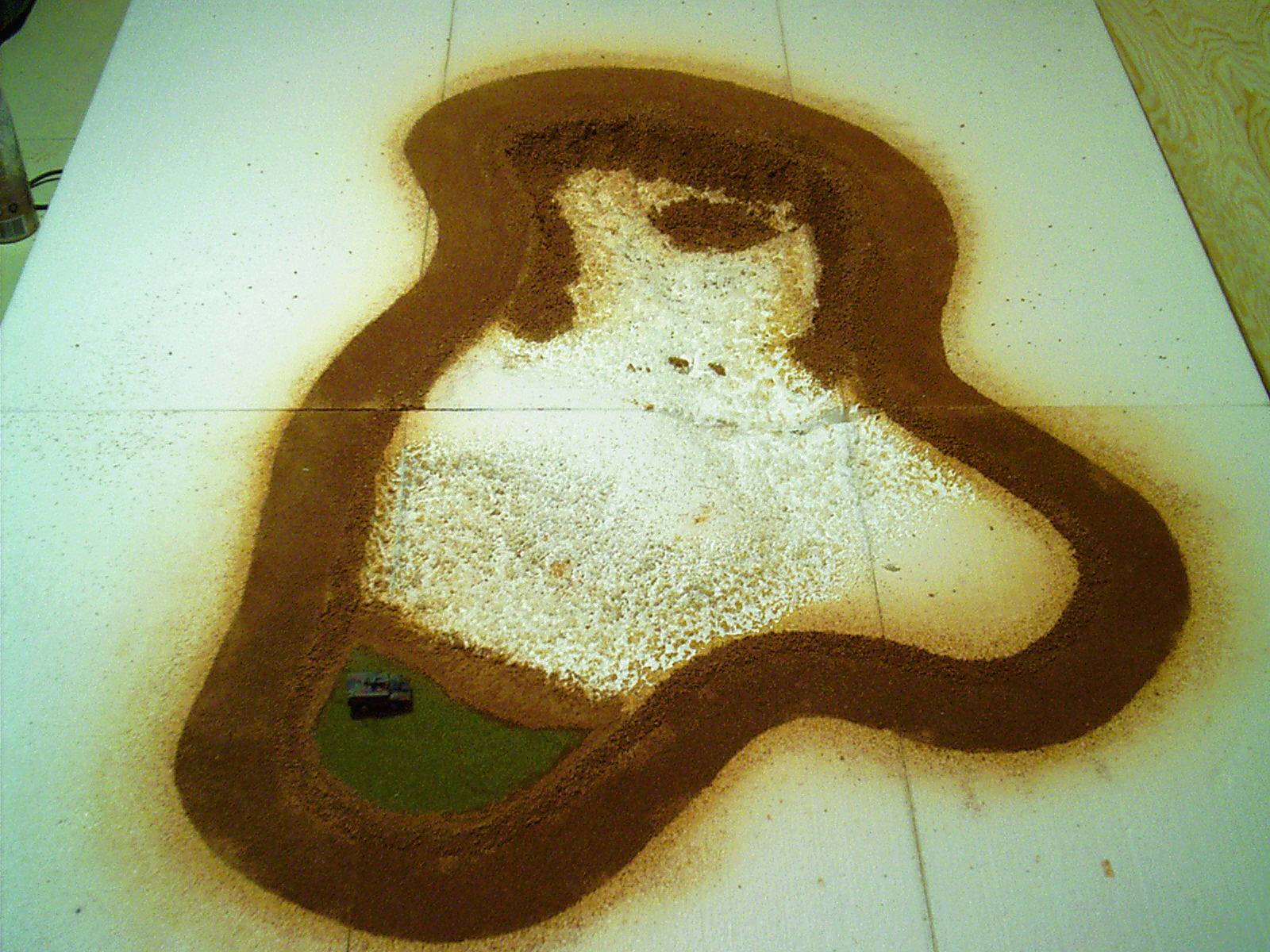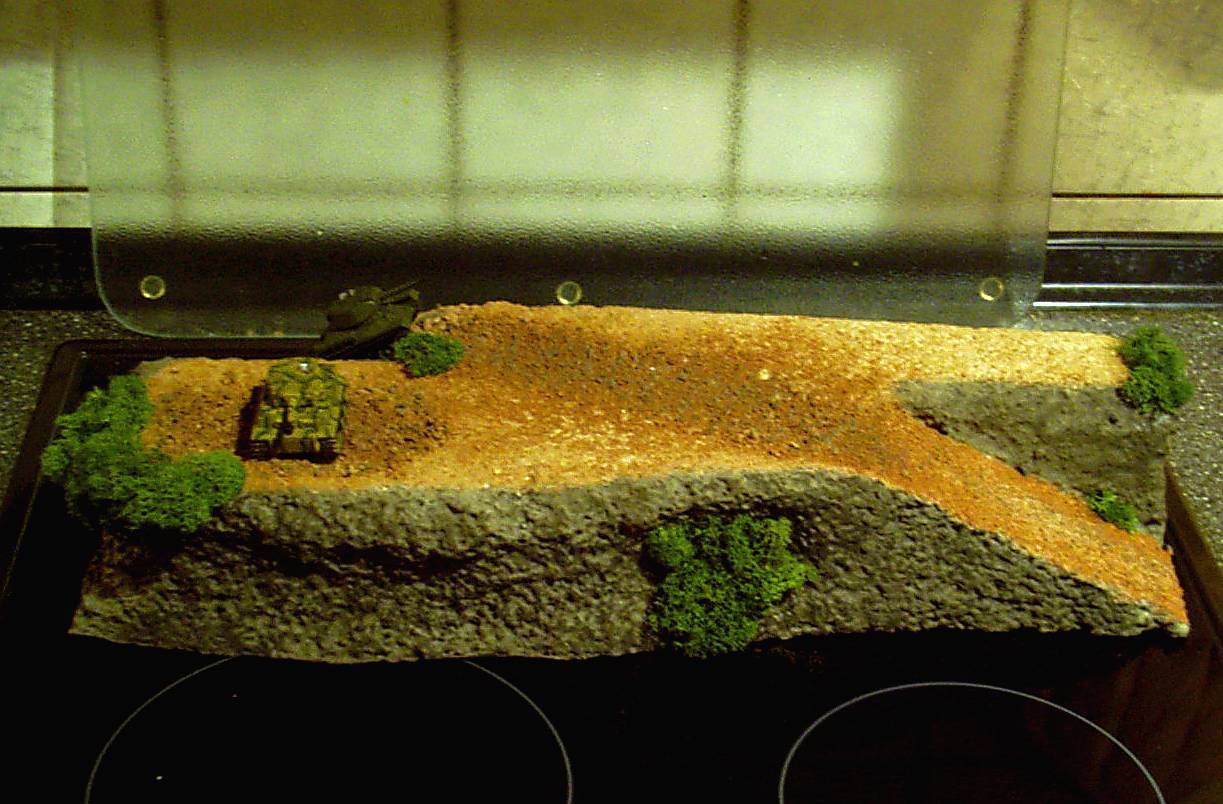 die Senken habe ich mit einem Heißluftföhn eingeschmolzen, so entsteht eine rauhe Struktur, wie sie auch an den Steilwänden des Berges zu sehen ist. Wald ist übrigens schon in Arbeit, sowie eine Höhle und in den vier Ecken für jeden Panzer eine eigene Heimat.