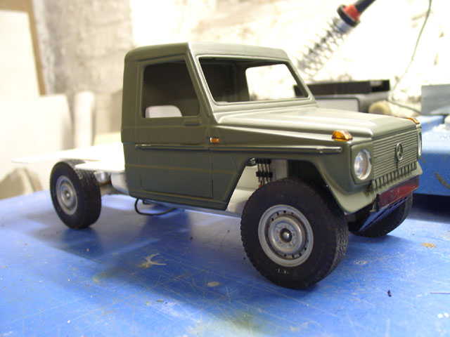 Abschließend mußte an den Achsen und der Bodenplatte den breiteren Reifen noch etwas Material abgenommen werden, damit man die Vorderachse auch lenken kann!