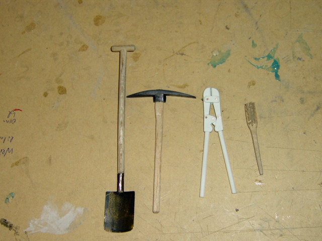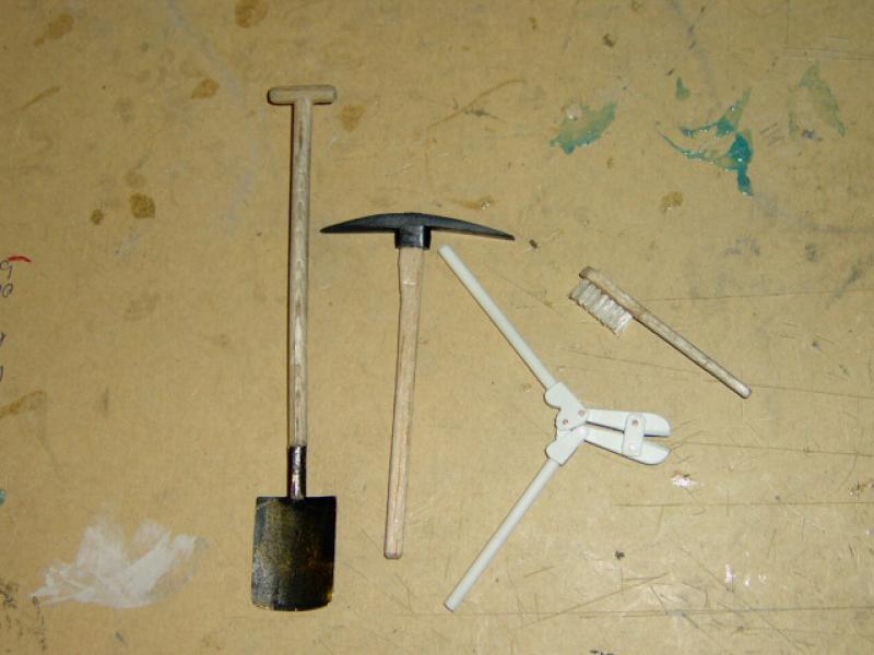 Sehr viel Aufwand ist in das Bordwerkzeug eingeflossen. Im Bausatz befinden sich nur eine Schaufel, eine Axt und die Säge, welche ich als einziges übernommen habe. Das Schaufelblatt ist aus Messing, der Stiel aus Balsaholz. An der Axt habe ich den Stiel ebenfals durch Holz ersetzt. Der Pickel und der Bolzenschneider sind kompletter Eigenbau. Und last but not least musste für den Handbesen eine alte Zahnbürste meines Sohnes herhalten (er hatte bereits eine neue). Mit dem Ergebnis bin ich sehr zufrieden.