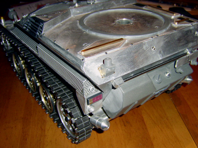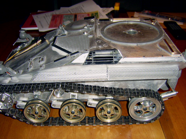 Da man in diesem Maßstab schon sehr viele Details erwarten kann, habe ich selbst Hand angelegt. So habe ich zum Beispiel das Lüftergitter auf der rechten Fahrzeugseite entsprechend korrigiert. die Lamellen habe ich dabei aus Kunststoff hergestellt. Als nächstes habe ich eine Reihe von Sechskantschrauben angebracht (vor allem hinten auf der Fahrgestelloberseite). Die Details hierzu stammen von den sehr guten Fotos von www.panzer-modell.de.