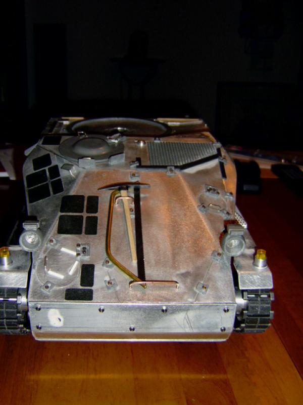 Viel Aufwand hat mich die Befestigung des Bordwerkzeuges gekostet. Die Schnellverschlüsse sind aus Messing, alle handgefertigt (ohne Maschinen), gelötet, mit dem Fahrzeug verschraubt und beweglich, so dass das Werkzeug entfernt werden kann. ;D