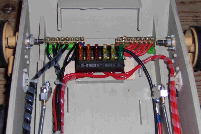 Ich hatte das Problem, dass trotz guter Kettenspannung im Gelände die Ketten immer wieder abliefen. Also hab ich ihm eine Art Sportfahrwerk mit neuen Kettenspannern verpasst und siehe da, auch im Gelände fährt er sich plötzlich sehr komfortabel und das Wichtigste - er behält seine Ketten. Ging Alles prima, bis dann eines Tages im August Nichts mehr ging! Grund dafür war ein Kurzschluss durch eine Scheuerstelle - mir wär der Panzer fast abgenrannt! Die gesammte Elektronik war nur mehr Schrott. Damit mir das jetzt nicht mehr passiert hab ich mit meinem Kollegen - übrigens Danke Egon - die Stromkreise aufgetrennt und jeweils mit einer Schmelzsicherung versehen (Bild). Funzt seither absolut problemlos.