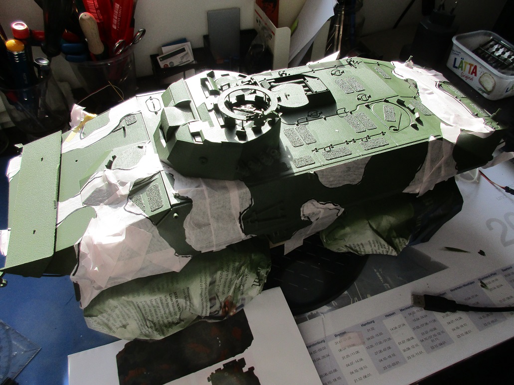 Da die Technik des Maskierens vor dem Lackieren ein doch etwas "Originaleres" Bild gibt- abkleben. Mühsam. Aber geschafft.