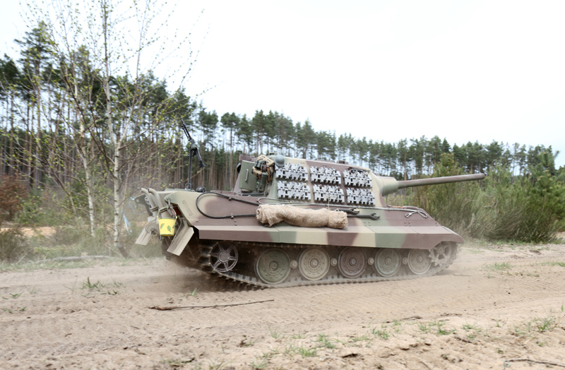 Zum Vergleich: mein Bigtanks-Jagdtiger wog mit den ursprünglich benutzten 43 Ah - Bleiakkus insgesamt 143 kg. Die Federung war an ihrer Leistungsgrenze angekommen, was sich optisch negativ bemerkbar machte: die Bodenfreiheit erreichte nicht mehr die gewünschte Höhe und nach dem Einfedern hatte das Modell buchstäblich Mühe, sich wieder in die Ausgangslage hochzustemmen. Ich habe daraufhin die vordersten und hintersten 2 Federn je Seite verstärkt. Nun stimmte zwar die Bodenfreiheit wieder, aber das Federverhalten wurde steif. Offenbar war die Gleitfähigkeit der Schwingarmlager an der Grenze angekommen.