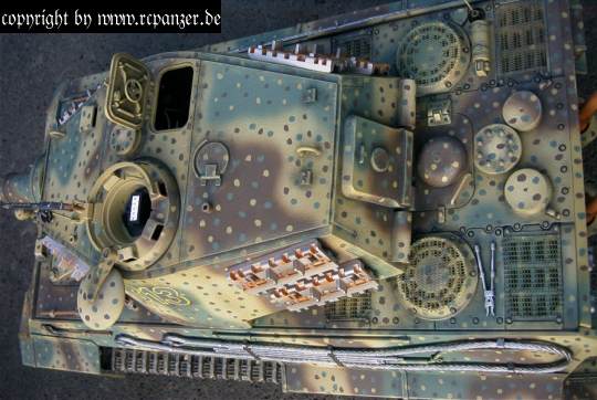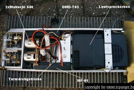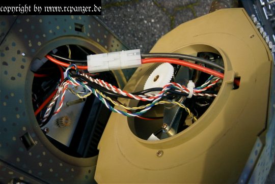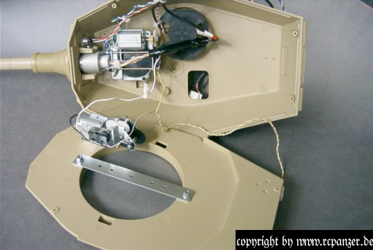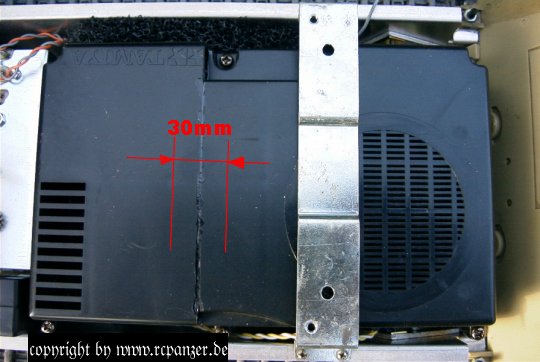 Der Platz in der Wanne ist, gegenüber dem Tiger I, doch sehr begrenzt. Was für mich zur Folge hatte, daß ein Akku in den Turm verfrachtet wurde und die Lautsprecherbox um 30mm gekürzt wurde. Die fehlenden 30mm in der Lautsprecherbox, vermindern aber nicht die Tonqualität.