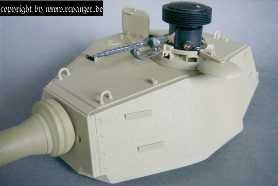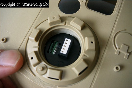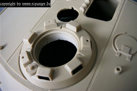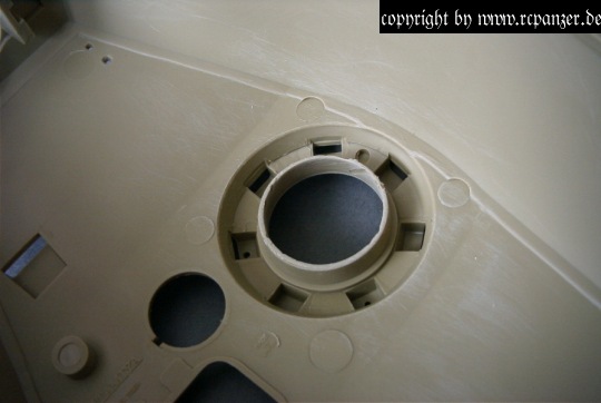 Für den Einbau des Battle-Unit´s wird der Boden der Komandantenkuppel aufgeschnitten. Die Ränder müssen dann soweit gekürzt werden, das das gesteckte Battle-Unit weit genug herausschaut.