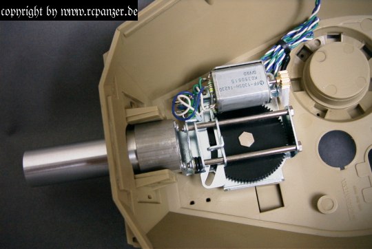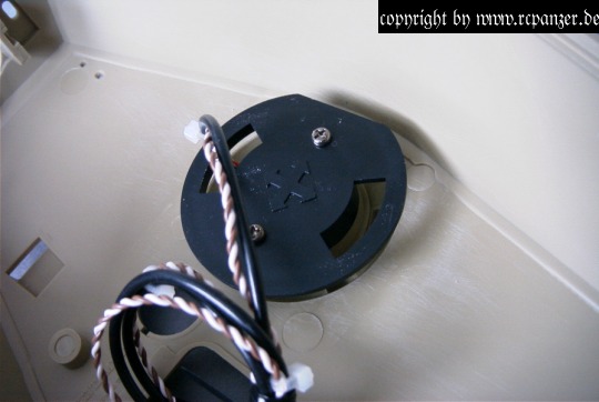 Ein Akku und der Empfänger liegen hinten unter der Lautsprecherbox. Das Akkukabel ist unter dem Turmdrehgetriebe verlegt.