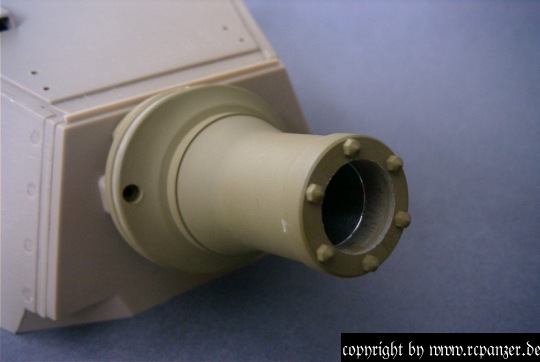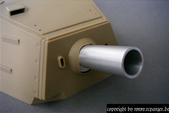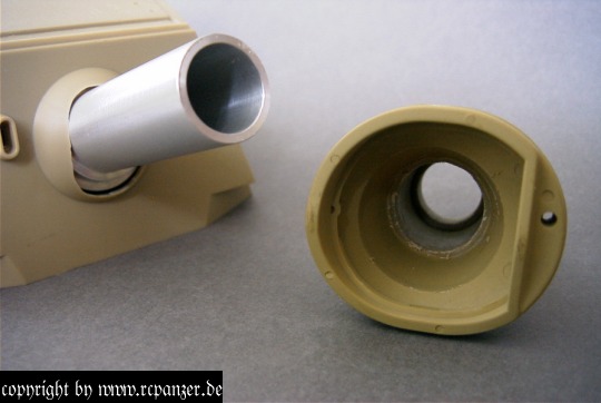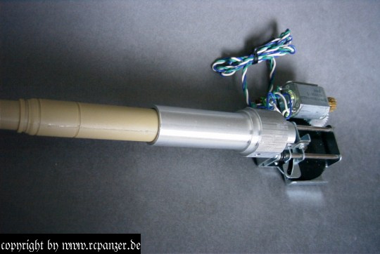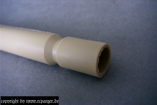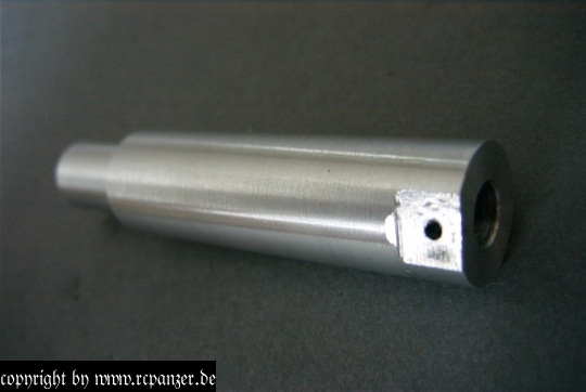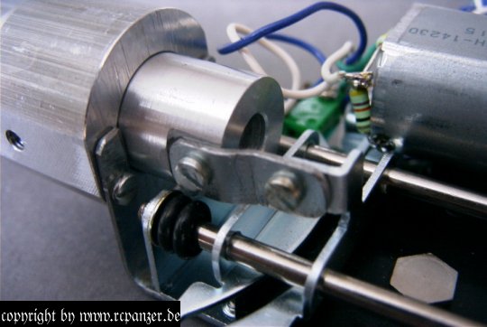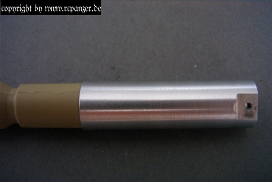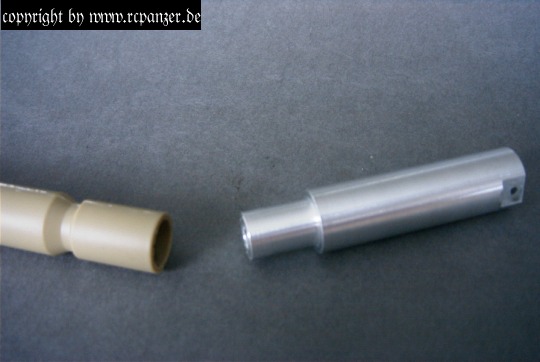 Damit der Rohrrückzug überhaupt funktionieren kann, muß das Rohr verlängert werden. Dazu habe ich eine Rohrverlängerung gedreht, auf welche das Kunststoffrohr gesteckt werden kann. Dieses wird nur stramm aufgeschoben um es nochmal demontieren zu können. Nur die Nase muß am Ende des Rohr´s innen entfernt werden. Dann wird die Verlängerung zusammen mit dem Rohr über einen kleinen Blechstreifen mit dem Rückstoßgetriebe gekoppelt. Hier kann ruhig etwas Spiel sein, um Achsversatz zu kompensieren. Die Verlängerung ist innen auf ø6mm aufgebohrt um das Blitzlichtkabel durchführen zu können. |