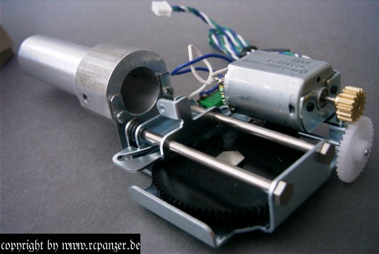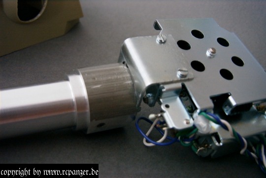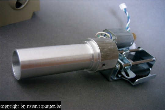 | Zuerst wird eine Aufnahme für das neue Rohr hergestellt, an welche das Rohrrückzugsgetriebe angeflanscht wird. Diese Aufnahme wird dann mit zwei M3 Zylinderschrauben mit der im Turm vorhandenen Halterung gelagert. |