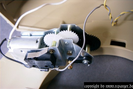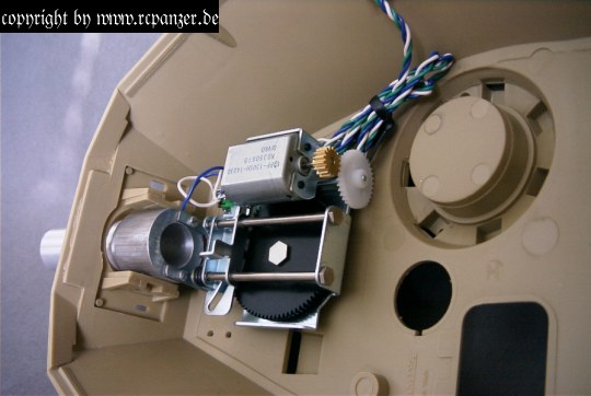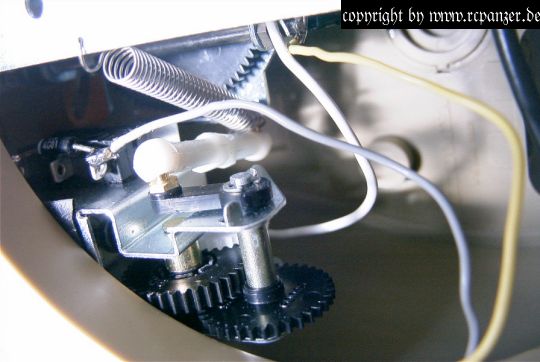 Die Hebe/Senkeinheit ist mit doppelseitigem Klebeband auf dem Turmboden befestigt. Eventuell besser mit Silikon oder ähnlichem befestigen. Ich wollte einfach keine Löcher in das Plastik bohren. An dem Getriebe ist einer der beiden Mikroschalter befestigt. Dieser Schalter wird von der Rohrrückzugseinheit, bei hochgestelltem Rohr betätigt. Die Feder dient dazu, das Spiel in der Anlenkung zu eliminieren. Sie wird in die Traverse eingehängt, an welcher der Turm gedreht wird. |