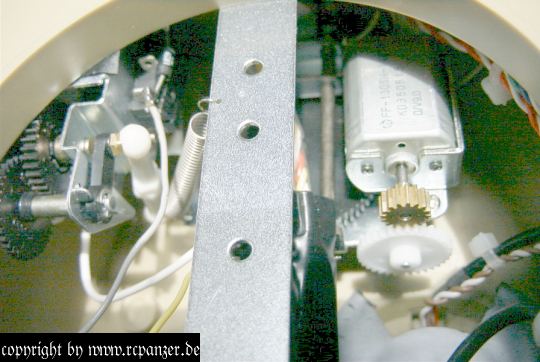 Um den Turm zerlegen zu können, muß die Hebe/Senkeinheit vom Rest abgekoppelt werden. Dafür muß das Kugelkopfgelenk getrennt werden und die Feder ausgehängt werden. Dann kann der Turmboden abgeschraubt werden und alle Einbauten liegen offen zugänglich. Bei montiertem Turm, ist der Eingriff schwer bis unmöglich. |