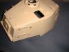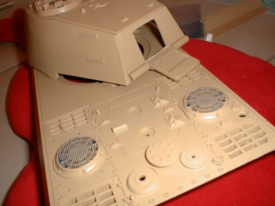 Die hinteren Schmutzklappen sollten, wenn der Panzer im mittleren bis schwerem Gelände gefahren werden wird, nicht montiert werden, da diese sehr schnell abbrechen und nur geklebt werden können. Die seitlichen Schürzen stören im Gelände nur bedingt, man kann sie aber auch leicht wieder abschrauben. Die häßlichen 2 Schrauben um das Wannenoberteil zu befestigen, entfallen beim neuen KT. Stattdessen hat sich Tamiya eine bessere Lösung einfallen lassen und die Halterungsschraube unter einer "Lüfterkappe" versteckt. Die Schraube läßt sich nun auch bequem ohne Werkzeug aufdrehen. Die "alten" Löcher sind allerdings noch vorhanden und müssen zugespachtelt werden.