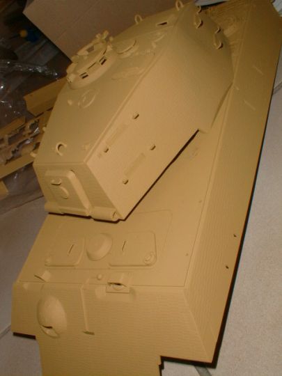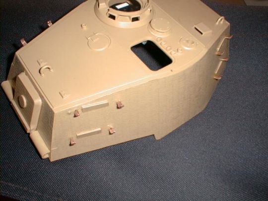Ganz neu ist die mitgelieferte Zimmeritfolie. Die bietet einem die Möglichkeit, schnell und relativ einfach, Zimmerit anzudeuten. Ich habe die Folie verwendet und nach dem ersten Airbrushen fast einen Schock bekommen: Wenn die Folie nicht haargenau sauber ausgeschnitten und auf Kante geklebt wird (was leider nicht immer Möglich ist), sieht man nach einer dünnen Schicht Airbrushfarbe, jede kleine Folienkante. Auch die "Saukopfblende" faltenfrei zu bekleben ist fast schon ein Kunststück. Erst als ich Schattierungen aufgetragen habe, sah man die Kanten kaum noch. Die "Saukopfblende" habe ich zudem an den Rändern gespachtelt, da diese sehr aufgesetzt aussah. Die Auspuffrohre wurden ein wenig aufgebohrt um sie realistischer aussehen zu lassen und Metallgitter aus dem Baumarkt auf dem Motorraum angebracht. Des Weiteren ist es noch empfehlenswert unterhalb der Lüftungsgitter, wie beim Pershing-Bausatz, schwarzen, dünnen Stoff zu kleben, da ansonsten ein Blick auf das Innenleben des Tigers gewährt wird.