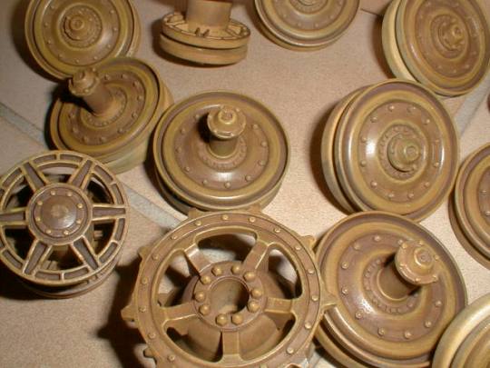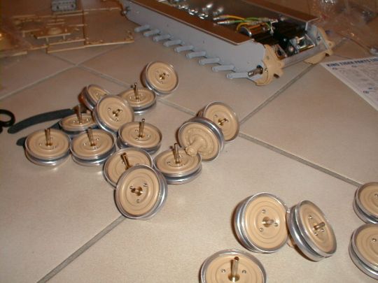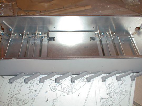 Sind die Schwingarme mit den Drehstabfedern erst einmal montiert, kommt der langwierigste Teil des ganzen Bausatzes (von der Lackierung einmal abgesehen). Die Montage der Laufrollen.