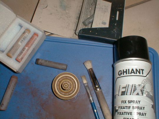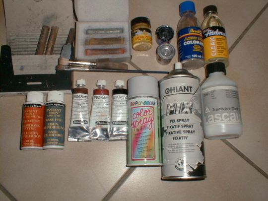 Die Bemalung war am aufwendigsten. Zuerst brushte ich den vorgrundierten Panzer in Sand- Matt Emailfarbe von Revell. Danach wurde das Modell mit Schmincke-Pastellkreiden bemalt, mit 2-Komponenten Kunstrost versehen und anfänglich mit einem Lack-fixateur besprüht, damit sich die Pastellkreide nicht miteinander vermischt. Vom 2-Komponentenrost war ich allerdings etwas enttäuscht, da er nicht das Rostbild abgab, das ich mir erhofft hatte. Auch die Ketten ließen sich damit kaum bearbeiten, und so griff ich zu "Sienna gebrannt"- Acrylfarbe von Schmincke. Diese muss stark verdünnt werden um die Beweglichkeit der Kettenglieder nicht allzu sehr zu beeinträchtigen. Trotzdem verklebte sich die Kette so sehr, das ich mit Siliconspray und Feile nachhelfen musste. Gerade die Metallketten sind bei dem Tiger 2 das Tüpfelchen auf dem i. Auch wenn die Geländegängigkeit etwas nachlässt, wird man durch einen souveräneren Lauf des Panzers entschädigt. Den etwas zu klein geratenen Panzerkommandanten habe ich im Gießast gelassen und ein 1:16, Tamiya Tank Crew Man, tront jetzt auf dem Turm.