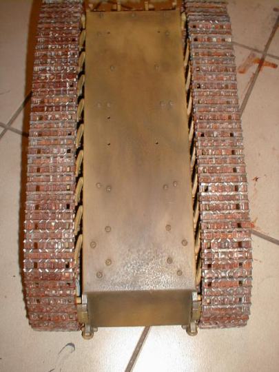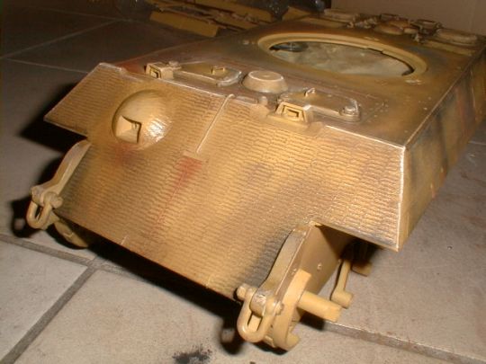 Wie zu sehen wird der Königstiger nur durch einen Akku angetrieben, obwohl der Platz auch für zwei Akkus reichen würde. Der Zusammenbau des ganzen Panzers gestaltet sich aufgrund der hervorragenden Passgenauigkeit der Teile, der guten Anleitung und den guten Platzverhältnissen im KöTi, sehr einfach und schnell. Erst beim Wannenoberteil und Turm gerät man ins Stocken. Sämtliche Luken sollen laut Anleitung an- oder zugeklebt werden; bzw. sind nur Attrappen wie die Heckluke am Turm. Zudem sind alle Griffe nur durch Erhebungen im Plastik angedeutet. Wirklich mies... Also habe ich die Richtschützenluke, die Kommandantenluke und die Heckluke beweglich gemacht. Zudem aus Kupferdraht Griffe montiert und aus Messingblech Ersatzkettenhalterungen gebastelt. Die Plastikerhebungen zwischen den Haltern hätte ich eigentlich entfernen müssen, doch so genau wollt´ ich es dann doch nicht nehmen, zumal diese Balken nicht zu sehen sind wenn ich Kettenglieder einhänge. Der Bausatz sieht weiterhin vor, die 4 Schekel einfach aufzustecken. Davon ist allerdings abzuraten wenn das Modell bewegt werden soll, da diese dann schnell verloren gehen. Also wird der angedeutete Schraubenkopf abgeschnitten, ein Loch in Schekel und Wannenbefestigung gebohrt und der Schekel mittels echter Schraube befestigt. Sieht aus wie das Original und hält.