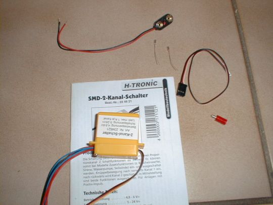 Da mein alter Königstiger Licht besaß, beschloss ich auch hier eine kleine Mikroglühbirne zu installieren. Ein 2-Kanalschalter (siehe Foto) wird das Licht per Sender ein- und ausschaltbar machen. Der 2. Kanal des Schalters wird irgendwann einen Rauchgenerator schalten, aber das hat noch ein wenig Zeit.