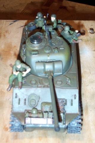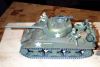 Das Modell wurde zerlegt und es wurden als erstes die häßlichen Gußnähte am Turm beseitigt. Bei der Demontage des Turmes sollte man äußerste Vorsicht walten lassen um nicht die drei Kabel die zum Infrarotempfänger in der Turmluke führen zu beschädigen. Der Heißkleber mit dem die kleine Platine unter dem Turmluk fixiert wurde lässt sich leicht lösen um das Bauteil zu entfernen. Sämtliche Anbauten wie Holzkisten, Reserverollen, Kettenglieder und Reservekanister wurden entfernt und die hinterlassenen Löcher zugespachtelt und verschliffen. Das Kanonenrohr wurde aus einem Messingrohr neu gefertigt. Vorsicht beim Abtrennen des alten Rohres. Unter der Übergangsnaht sitzt ein Metallstift der nach Möglichkeit nicht abgetrennt werden sollte da er zur Fixierung des neuen Rohres gut geeignet ist. Nach dem Spachteln und Verschleifen wurde das Modell mit Gunze Nr. 64 (Olive Drab) lackiert. Die Sterne wurden mittels Schablone auflackiert. Die Holzkisten, Reservekanister, Rollen usw. wurden separat lackiert und bis auf die Kanister an anderer Stelle wieder aufgeklebt. Das MG wurde so umgebaut daß es drehbar ist. In den Turm wurde ein Stahlstift eingeklebt und das MG erhielt eine passende Aderendhülse als Aufnahme. An der Front des Panzers habe ich ein Stück Plasik als Planke zwischen den Kettenschutzblechen eingeklebt. Dort wurden dann diverse Teile wie Holzkiste, Reservekanisrter, Rucksäcke und Zeltplane aus dem TAMIYA Zubehörprogramm plaziert. Die Reserveketten wurden so auseinadergesägt daß eine Reihe Kettenglieder übrigbleibt, lackiert und auch dort vorn plaziert. Am Heck wurden ebenfalls diverse Anbauteile wie Holzkiste, Reservekanister und Munitionskiste auf der Ablage plaziert.