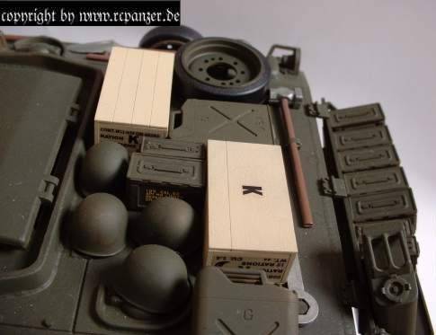 Neu ist das bewegliche und sehr gut detaillierte MG (das alte war wirklich nicht schön und wurde hier durch ein Verlinden MG ersetzt), die Kommandantenfigur, sowie Helme, Kisten und Kanister.