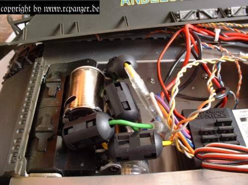 Zeitweise trat das Problem auf, dass der Sherman bei konstantem Gas am Sender fuhr als würde ich mit dem Gas spielen (rückende Fahrweise). Nach viel probieren (andere Akkus, Empfänger, Quarze, mal mit - mal ohne Soundeinheit...) fand ich die Ursache. Die MF Einheit hat die DMD (der Regler) gestört. Das Fahrverhalten konnte nach lokalisieren der Ursache mit einem Ferritkern am Verbindungskabel zwischen DMD und MF normalisiert werden. Ich muß mich nur fragen, ob ich hier mit meinem Sherman nur „Pech“ hatte oder ob dieses Verhalten auch bei anderen Fahrzeugen auftritt. Ich erwarte, dass die verwendeten und mitgelieferten Elektonikteile störungsfrei miteinander funktionieren.