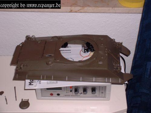 Die Rohrblende sitzt sehr stramm im Turm und kann durch das Höhenrichtgetriebe kaum bewegt werden. Das Problem kann jedoch schnell durch feilen an den Lagerzapfen im Turm behoben werden. Idealer weise muß die Rohrblende ohne Unterstützung durch das Getriebe sofort an den unteren Anschlag fallen. Das Getriebe für den Turmantrieb und das Höhenrichtgetriebe sind, wie auch beim Tiger I, sehr einfach und mit großem Spiel ausgelegt. Besonders der Schneckentrieb im Getriebe sorgt für einen lauten Lauf. Ohne Sound hört sich das alles andere als gut an also besser die Soundeinheit lauter stellen.