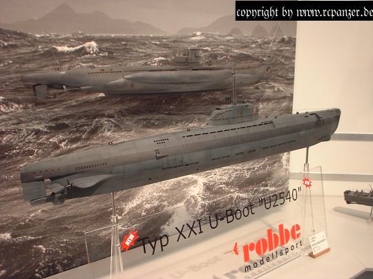 Robbe stellte sein neues U-Boot, die U2540 vor. Das Modell ist im Maßstab 1/40 gehalten und ca. 1900mm lang. Das Modell stellt ein Deutsches U-Boot des Typ XX1 dar. Für mich die schönste Neuheit der Messe.