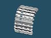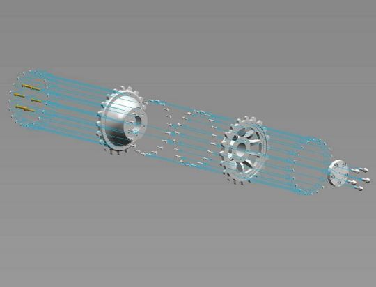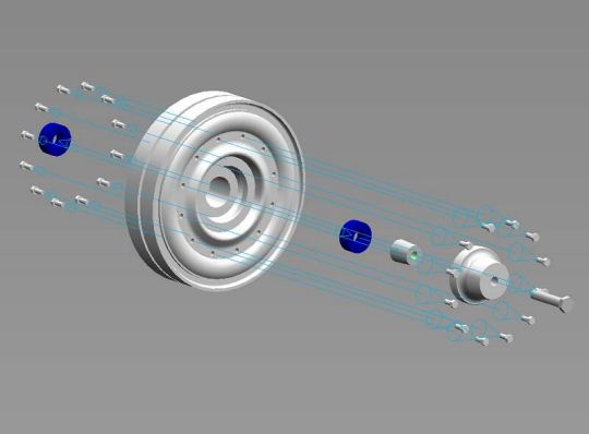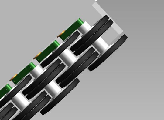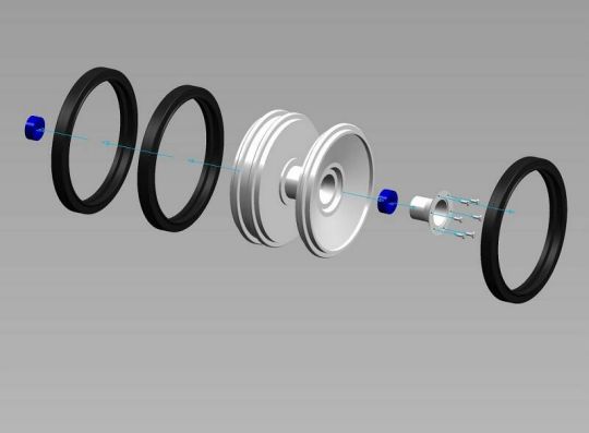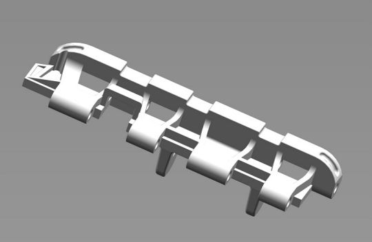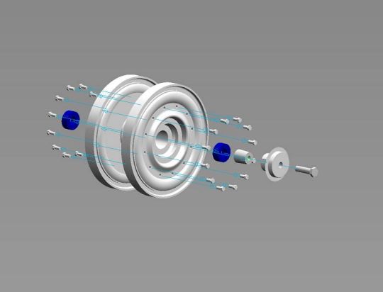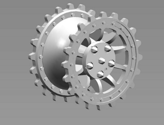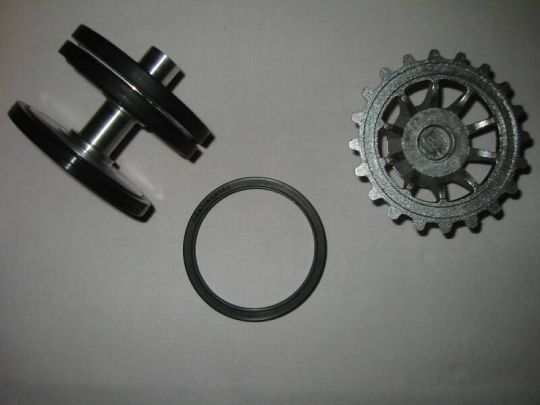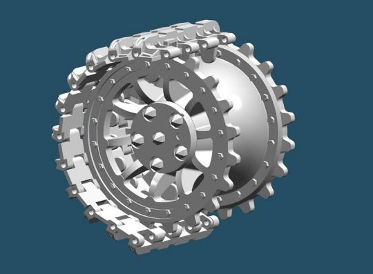 | Wie nicht anders zu erwarten stellte uns die Kette vor das größte Problem. Um weiter zu kommen erstellte ich 3D Zeichnungen eines Kettengliedes mit denen wir ‚hausieren’ gehen konnten. Das Ergebnis dieser Aktion verlief allerdings sehr enttäuschend. Es haben nur wenige Gießereien geantwortet. Die haben uns die Kette entweder zu horrenden Preisen von bis zu 9,0 € je Neusilberglied zuzüglich Materialkosten angeboten, oder aber sie konnten das Glied nicht in der gewünschten Genauigkeit herstellen. Also musste Mal wieder der Zufall helfen, der mich aus ganz anderen Gründen mit einer Gießerei in meiner Nähe zusammengebracht hat. Hier werden nun unsere Kettenglieder in Aluminium Kokillenguß zu einem hochanständigen Preis hergestellt. Auch alle weiteren Gussteile wie die Spannrolle oder das Triebrad lassen wir dort gießen. Das Triebrad besteht aus 2 Teilen, welche durch Schrauben und eine H7 Passung miteinander verbunden werden. Die Idee den Zahnkranz Demontierbar zu gestalten haben wir wieder verworfen. Das Selbe gilt für die Spannrolle. Die Laufrollen werden von Volker an einem Stück gedreht. Durch diese Vorgehensweise können die Laufrollen an der nicht sichtbaren Innenseite nicht Originalgetreu ausgeführt werden, was aber zu verschmerzen ist. Die Laufrollen haben eine Wulst, über die der Reifen gestülpt wird. Die Form für die Reifen wurde ebenfalls von Volker erstellt. Die Reifen werden aus einem UV beständigen Kunststoff gegossen. Der Continental Schriftzug wurde von Volker negativ in die Form gelasert. Die Seitenvorgelege werden ebenfalls gegossen. Die Spannblöcke hat Torsten gefräst, die Achsen der Laufrollen, immerhin 208 Stück, wurden ebenfalls von Torsten hergestellt. |