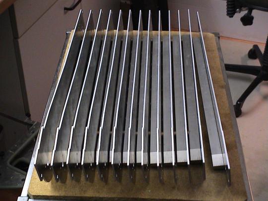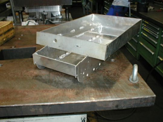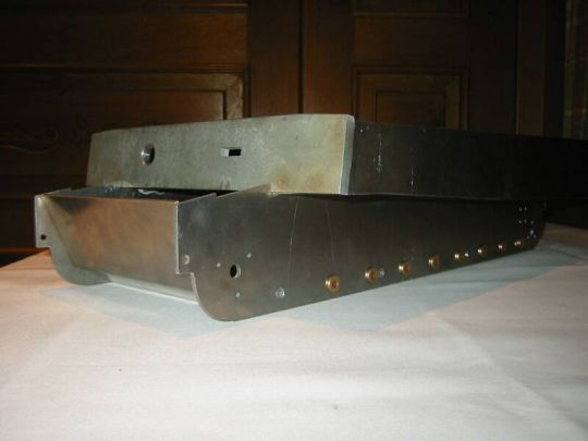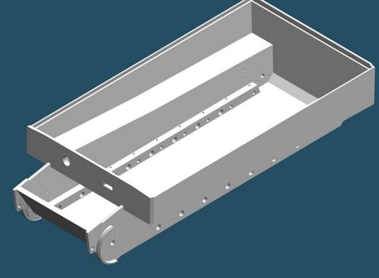 | Die Wanne besteht aus 3mm starken Alu Platten. Ich habe die Wanne so konstruiert, dass insgesamt 7 Hauptteile und einige Nebenteile zum Einsatz kommen. Die Nebenteile dienen dazu, an Stellen wo die Panzerung sichtbar ist, und mehr als 3mm beträgt, die tatsächlich Stärke der Panzerung vorzutäuschen. Die Bodenplatte besteht zusammen mit der schrägen Front und dem Heck aus einem Teil. Die Einzelteile wurden von Manfred gelasert und gekantet. Die senkrechte Frontplatte hat er aus 10mm Alu gefräst. Nachdem Uli die Lagervierkante eingebaut hatte, hat Manfred die Wannen geschweißt. Da durchgehend Schweißnähte aus thermischen Gründen nicht in Frage kamen, haben wir die Wannen nur gepunktet. Der Stabilität schadet die in keinem Fall. |