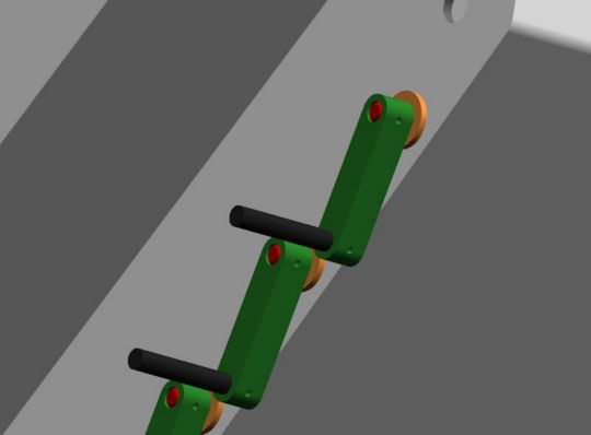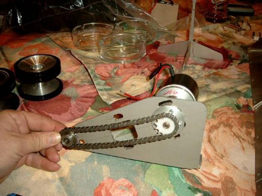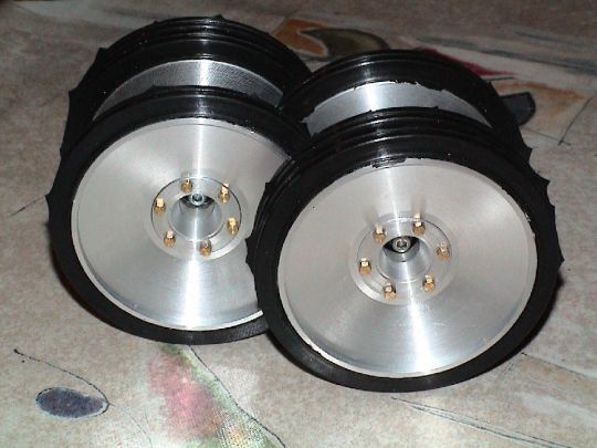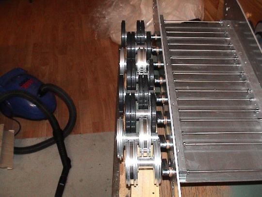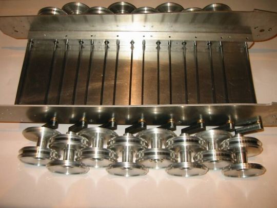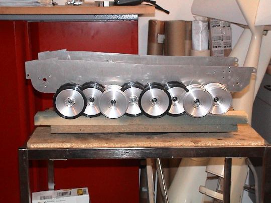 | Zwischenzeitlich wurden Muster der Kettenspanner, Drehstabaufnahmen und Drehstäbe angefertigt. Rüdiger hat die Schwingarme fertig, die ersten Laufrollen von Volker sind da, so das ein Musterfahrwerk aufgebaut werden kann. |